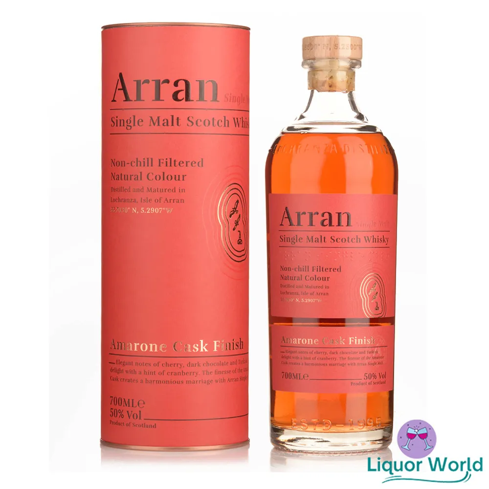 Arran, Amarone, ‘Cask Finish’ is a premium single malt Scotch whisky that is matured in traditional oak casks and then finished in specially selected Amarone wine casks. This unique cask finish imparts rich fruity and spicy notes to the whisky, resulting in a complex and layered flavor profile.