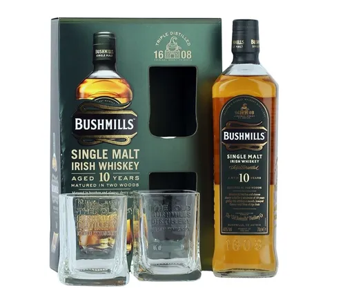 Bushmills 10 Year Old + 2 Glasses Gift Pack Single Malt Irish Whiskey 700mL Light, fruity and spicy aromas mixed with the taste of melted chocolate that rests on the tongue before the lightest hint of honey in your cheeks, Bushmills 10 Year single malt is the first of the single malts and the one that will leave you with an exceptionally smooth finish.