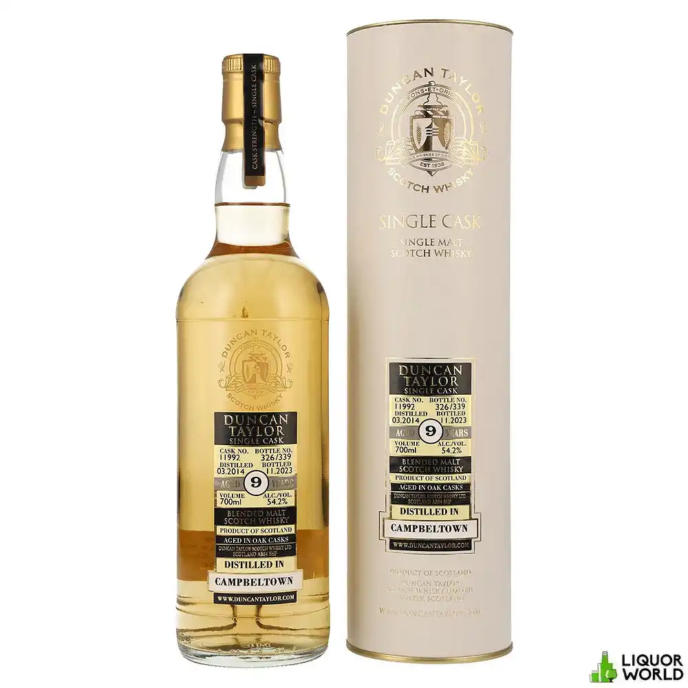 Experience the bold and dynamic flavors of Duncan Taylor 9 Year Old Campbeltown Distillery Cask Strength Blended Malt Scotch Whisky. This exceptional whisky, bottled at cask strength, showcases the unique and robust character of Campbeltown malts. Presented in a 700mL bottle, it offers a rich and complex flavor profile, shaped by its careful maturation and expert blending. Ideal for whisky enthusiasts and collectors, this cask strength edition promises an intense and memorable tasting experience.