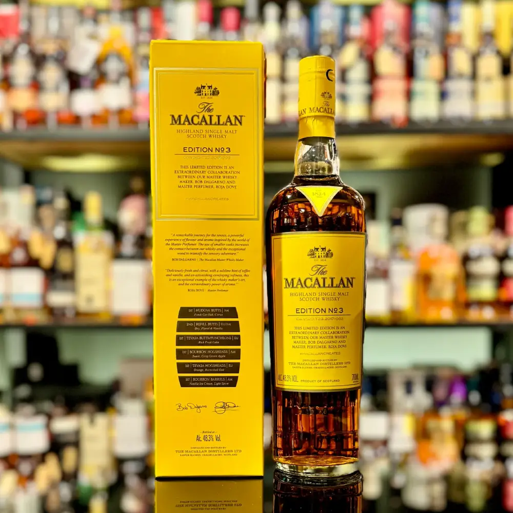 Explore the sophisticated complexity of The Macallan Edition No. 3 Single Malt Scotch Whisky, a harmonious blend created in collaboration with Master Perfumer Roja Dove. Presented in a 700mL bottle, this unique edition is part of The Macallan’s esteemed Edition Series, renowned for its distinct character and expertly curated flavor profiles. Edition No. 3 offers a sensory experience that combines the craftsmanship of The Macallan Edition No .3 with the olfactory expertise of Roja Dove, delivering an unforgettable whisky with a rich, layered aroma and taste.